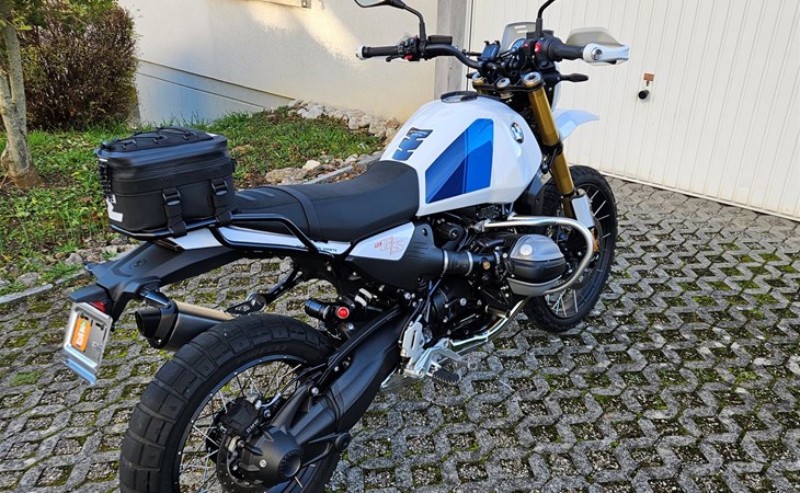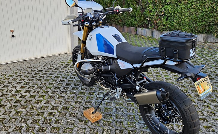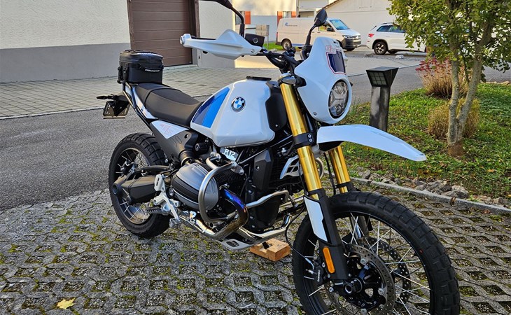2. Sitzbank in Schwarz (Tief), Gepäckträger (Unit Garage), BMW Motorschutzbügel, Auspuffhalter für ohne Soziusrasten.